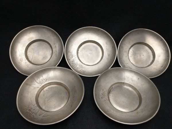 - 茶托 5枚セット 錫 茶器 煎茶道具 金属工芸 レトロ アンティーク (22_50307_7)