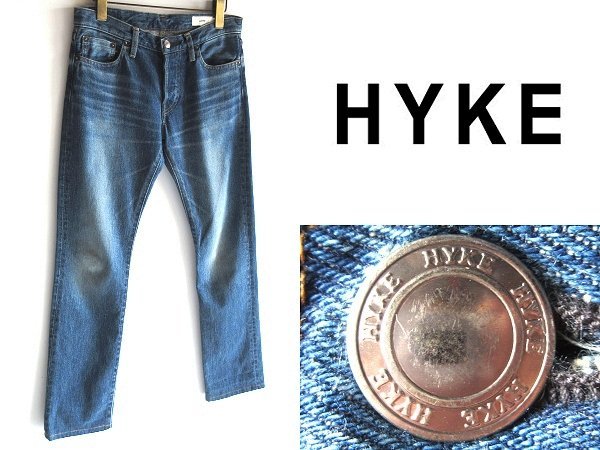 > HYKE ハイク 定番型 TIGHT STRAIGHT ビンテージ加工 ボタンフライ タイトストレート デニムパンツ 27 インディゴ 藍 日本製 green グリーン