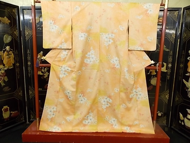 - きもの今昔4308 合繊のきもの 広衿袷手縫仕立てきもの ポリエステル100%の綸子織地 橙色濃淡に花柄 身丈159cm