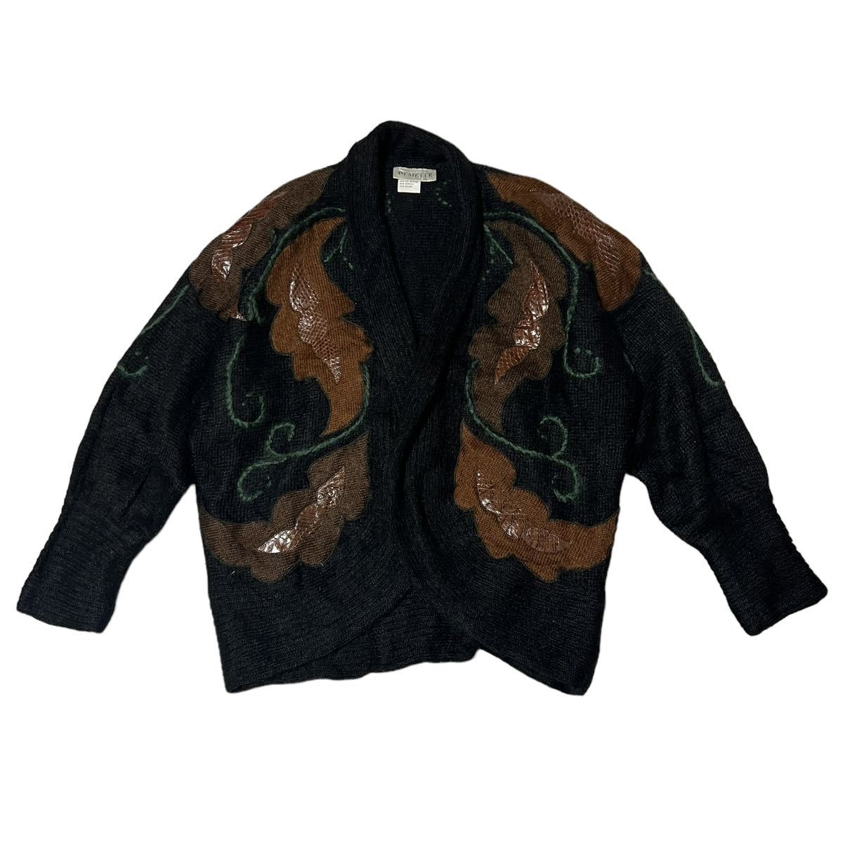 - 【1980s】ビンテージ モヘアニットカーディガン パッチワーク 刺繍 古着 セーター ウール アルパカ レザー