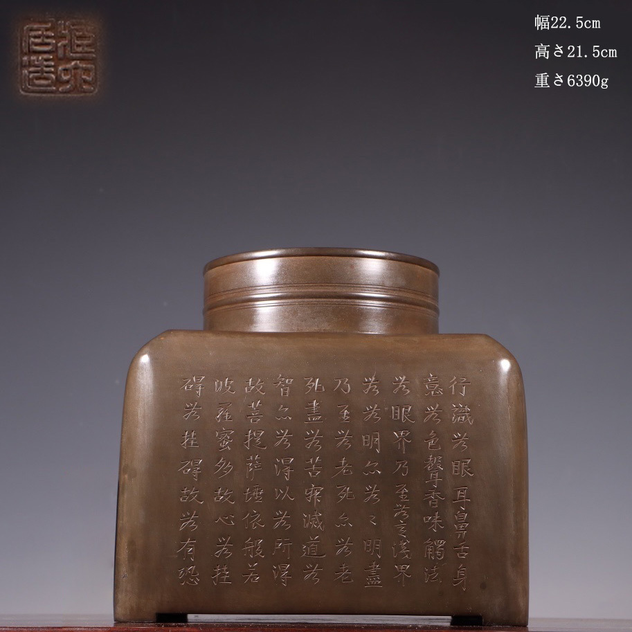 - 古錫 茶葉罐 藏六居造 「錫製波羅蜜多心経大口径超大茶心壺」 茶筒 茶入 茶壷 茶道具 金工 純錫 時代物 LT-1211