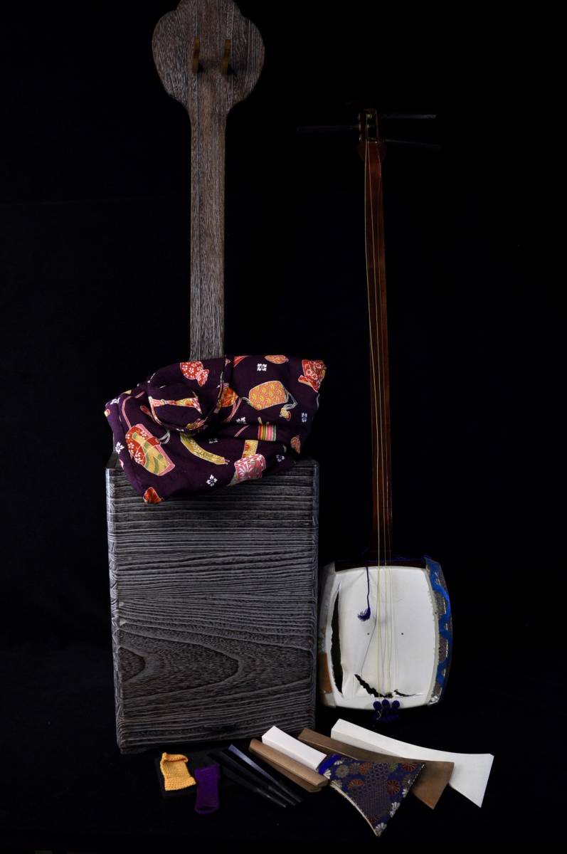 - 昭和期 練習用三味線 丸打胴 時代物双桐箱 バチ3本※カケ有り 糸巻き3本 指掛2つ 滑り止め1枚 ハンドメイド三味線カバー MEK412