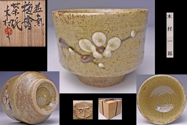 - 木村一郎 ★ 梅絵茶碗 ★ 共箱栞 ★ イッチン 筒描 の梅 ★ 益子焼 の人気陶芸家 ★ 灰釉 ★ 木村充 の父