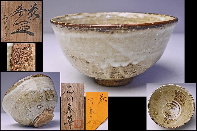 > 石川春華 か 石川春尊 か ★ 萩 茶碗 ★ 共箱 手書き共布 ★ 出雲焼を思わせる釉景 ★ 茶道具 ★