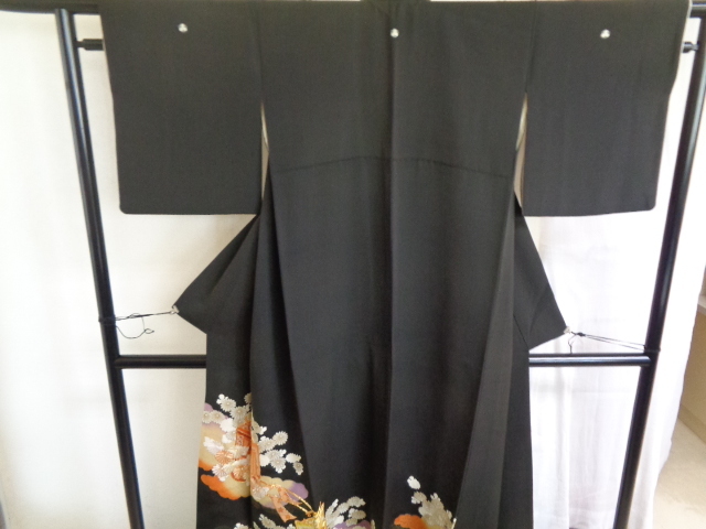 - c402-80 黒留袖 京友禅 正絹 比翼仕立て 裾綿入り 五つ紋 金糸刺繍 金彩 駒刺繍 御所車雲菊文 裄62センチ 身丈145センチ