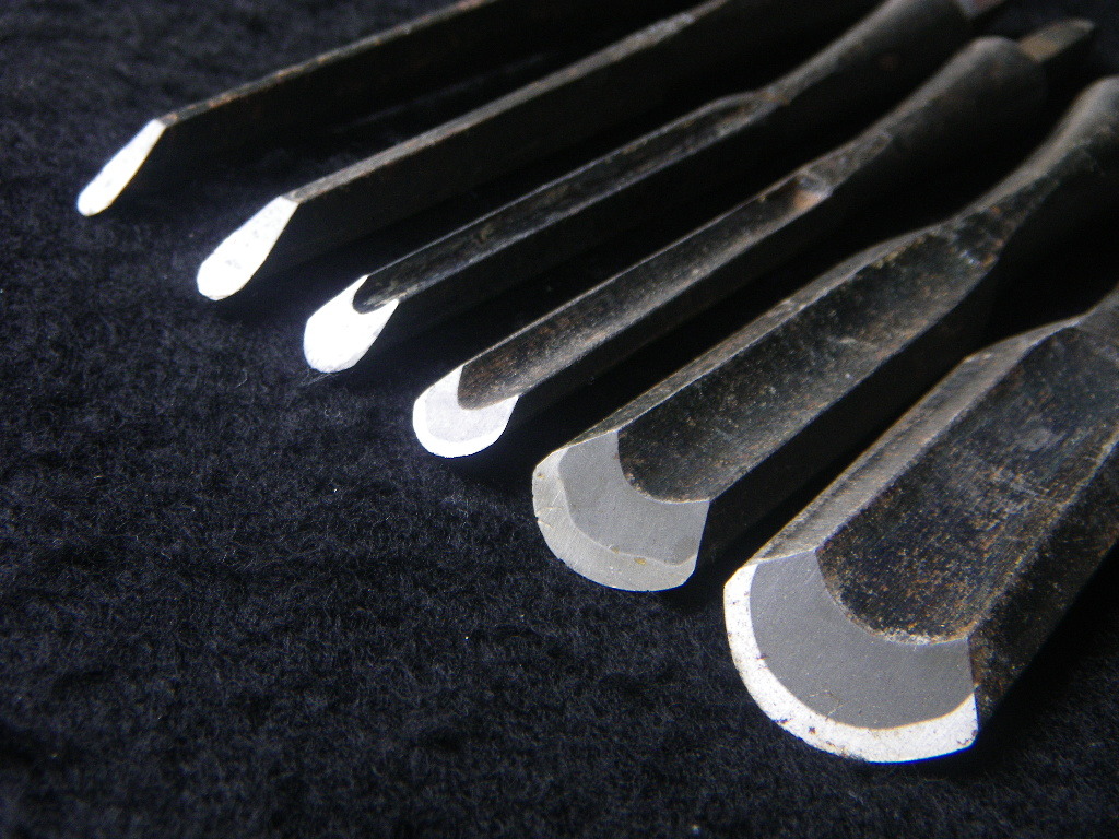 - 丸鑿の穂 刃 外丸 裏丸 追い入れ 3㎜ 5㎜ 6㎜ 8㎜ 15㎜ 21㎜ 柄無 6本 新品置き古し品 彫刻 大工道具 日本製 round Chisel