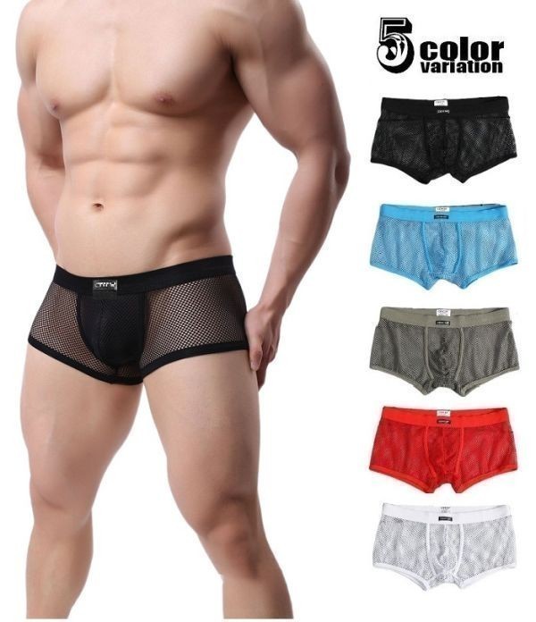 > 送料無料 メンズ下着 ボクサーパンツ エロ下着 網パンツ 男性下着 通気 透け レースボクサー ベースレイヤー PJ0002 黒 LL