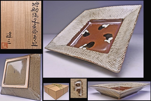 > 島岡達三 ★ 地釉 縄文 象嵌 角皿 ★ 共箱 ★ 人間国宝 ★ 師:浜田庄司 ★ナスの様な文様が愛らしい景色 ★ 検 島岡桂 バーナード・リーチ