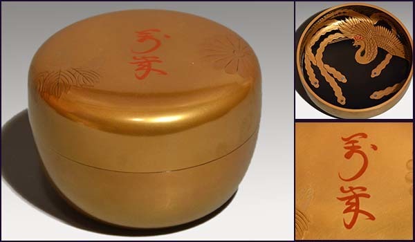- 金地に高台寺蒔絵棗 蓋裏豪華鳳凰蒔絵 上部に萬歳朱書き入り 未使用 真塗箱入り 茶道具 木工芸 漆工芸 a0988
