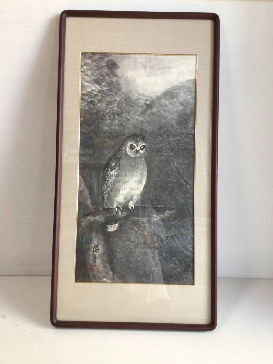 - C678 額入り絵画 水墨画 フクロウ ミミズク 『梅香』署名あり 縦額 木枠 大きい 1点 コレクション インテリア