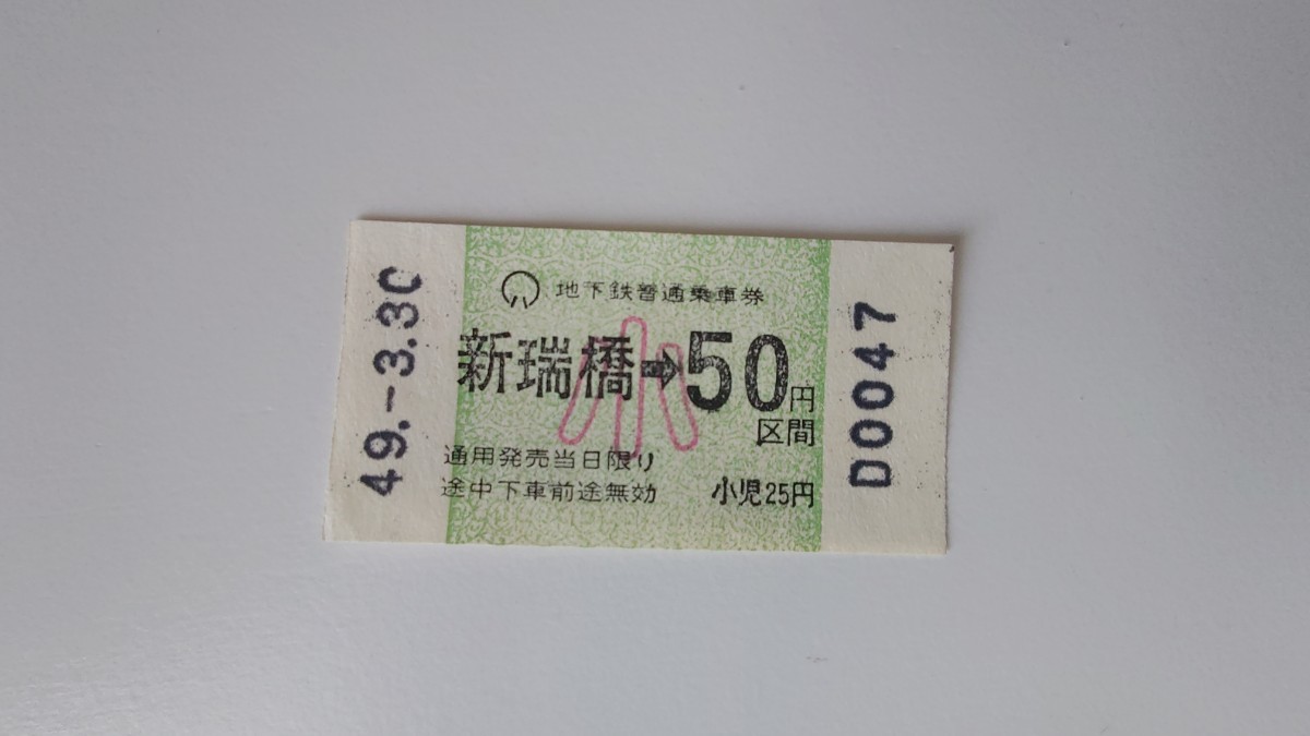 - ▲名古屋市交通局・名城線開業初日▲新瑞橋→50円区間小児用乗車券▲券売機券昭和49年