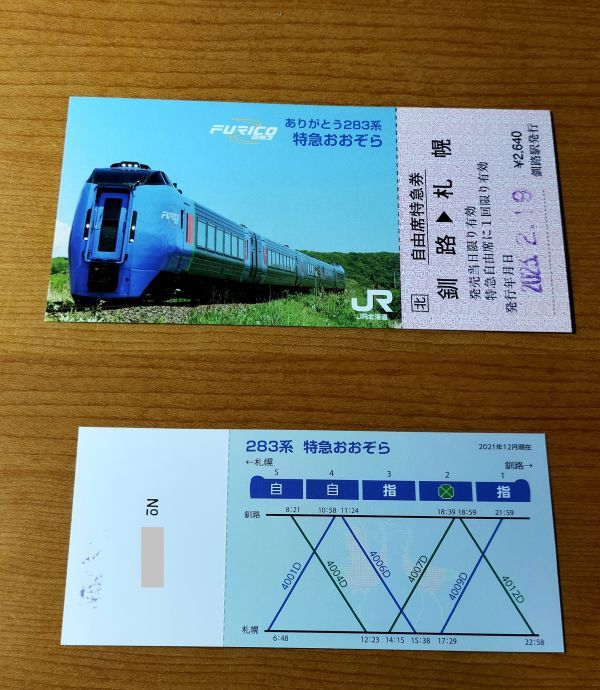 - ◆JR北海道◆「ありがとう283系 特急おおぞら」 記念自由席特急券 釧路→札幌 日付「2023年2月」