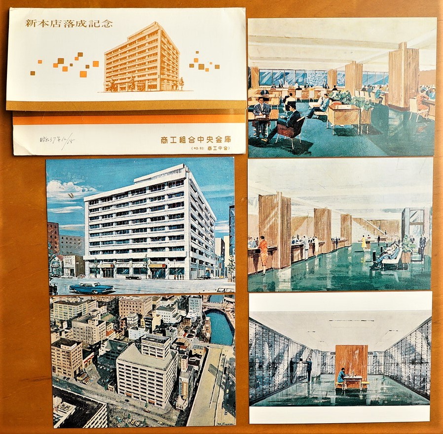 - 商工組合中央金庫 新本店落成記念 絵葉書 5枚 紙ケース付 検:東京都中央区八重洲 商工中金本店全景 ロビー 貸金庫室 ワリショーリッショー