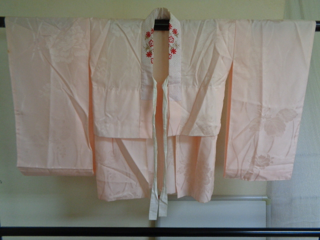 - C574-80 長襦袢 袖無双 刺繍半衿付き 立涌花草織文 着丈68センチ (+身あげ幅18.5センチ 裾あげ44.5センチ) 裄68センチ
