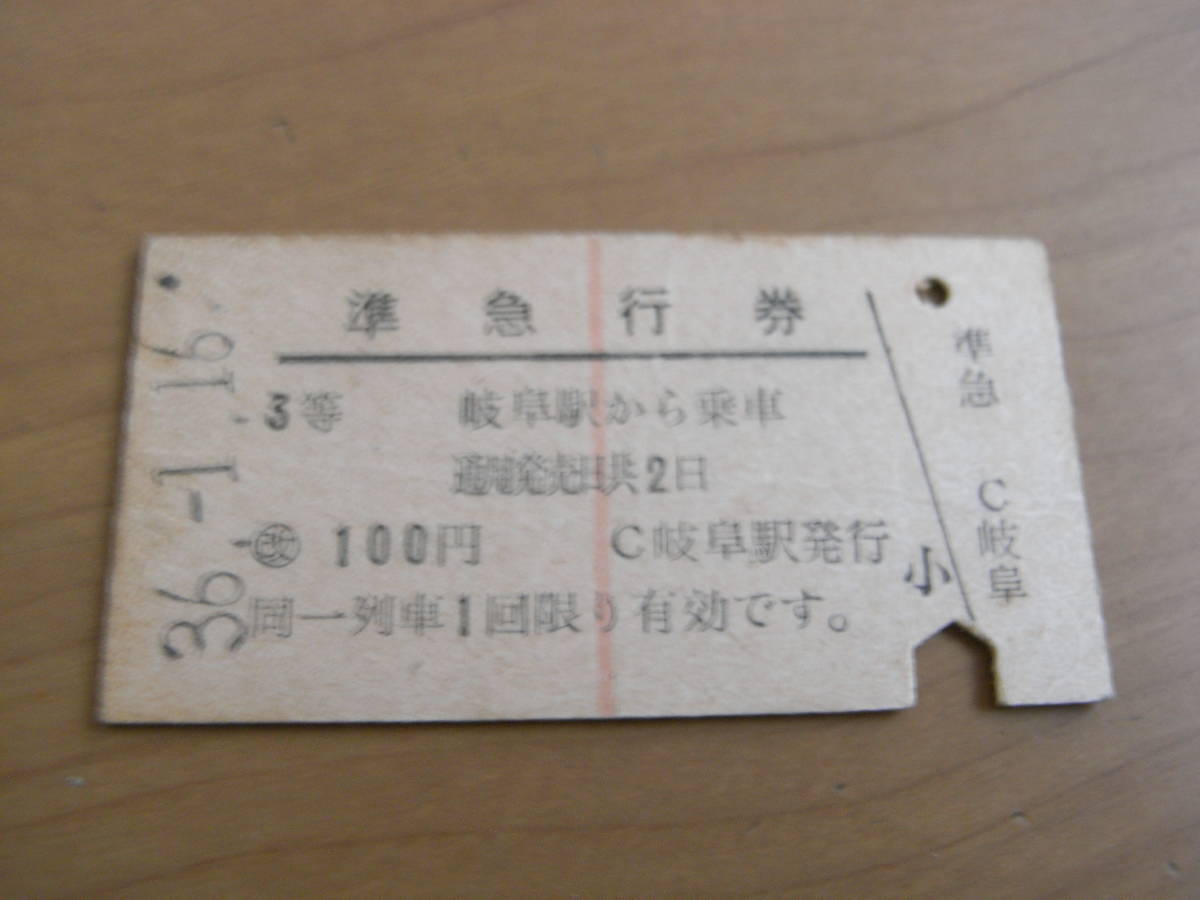 - 準急行券 3等 岐阜駅から乗車 100円 昭和36年1月16日 岐阜駅発行
