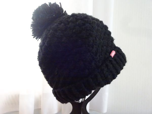 > 〃IGNIO〃レディース・ガールズ 黒色帽子 編み込みハット ポンポン付ニット帽 サイズ57cm〜59cm キャップ 帽子