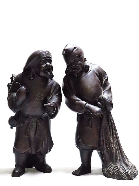 - 古銅置物 恵比須約33.5cm 大黒天約31.5cm 立像 象嵌 時代