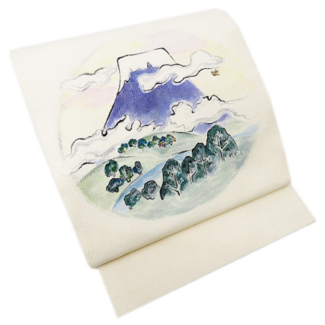 > 名古屋帯 中古 リサイクル 正絹 縮緬地 ちりめん カジュアル 仕立て上がり お太鼓柄 風景 富士山 生成色 多色 きもの北條 A842-1