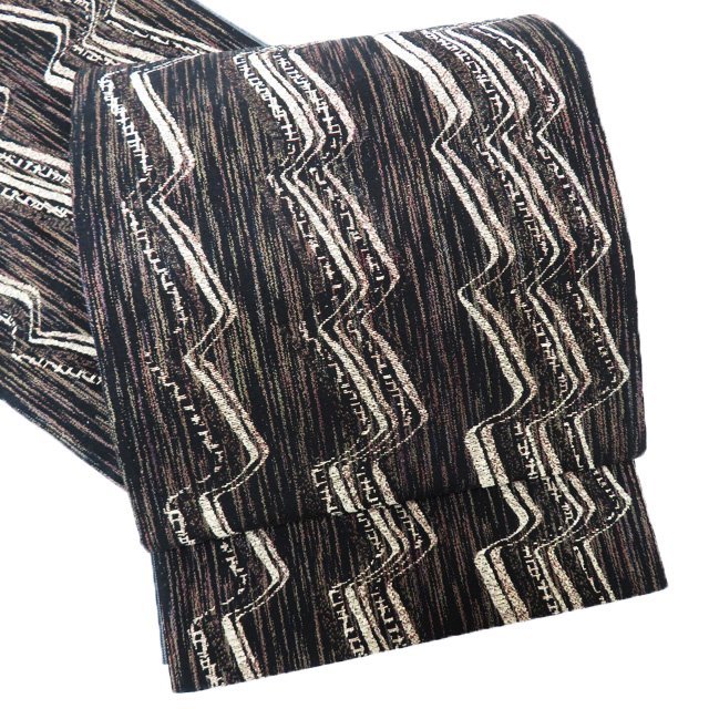 - 袋帯 中古 リサイクル 正絹 カジュアル 仕立て上がり 六通 ジグザグ模様 黒色 多色 きもの北條 A850-10