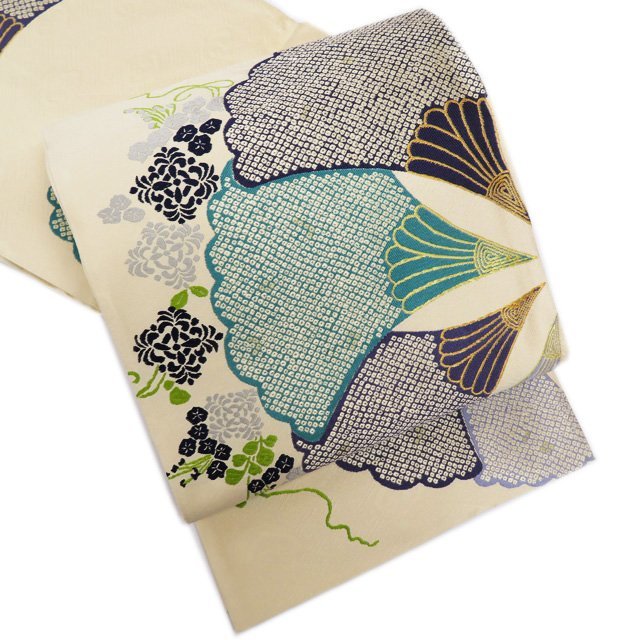 - ★きもの北條★ 特選 植物文様 花の図 鹿の子模様 地模様 個性と気品に満ちた逸品 練色 多色 金 袋帯 A800-13 【中古】