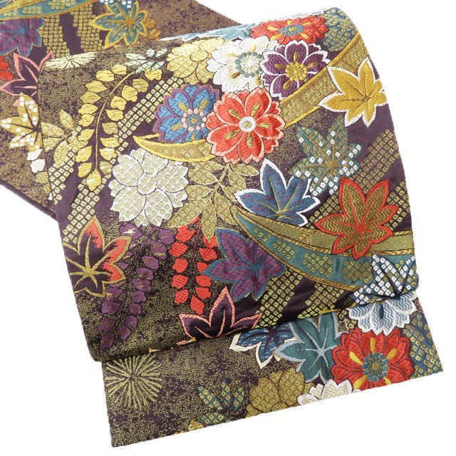 - 袋帯 中古 リサイクル 正絹 フォーマル 仕立て上がり 六通 楓舟 花の図 楓 桜 藤 菊 茶色 多色 金 きもの北條 A866-14