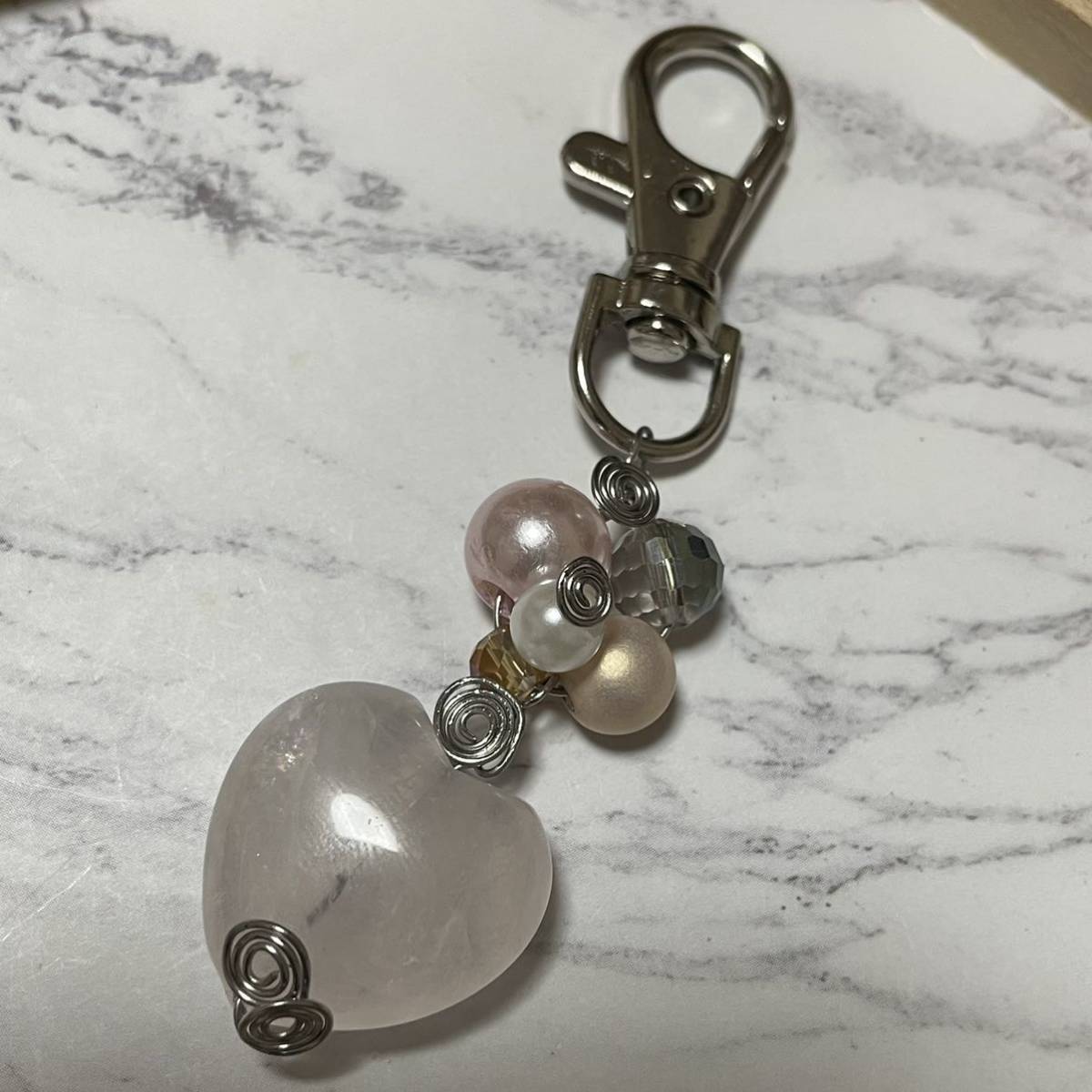 - key12. ハート ローズクォーツ の キーホルダー ワイヤーワーク 天然石 バッグチャーム