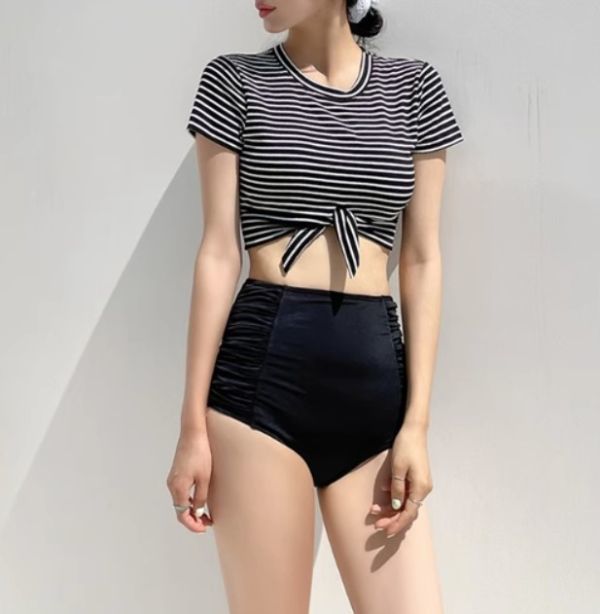 - 【イチオシ厳選商品】 レディース 水着 セパレート 半袖 ボーダー柄 ハイウエスト d91
