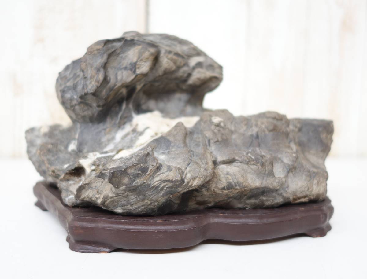 - 天然石 原石 鑑賞石 *鑑賞石 珍石 飾石 奇石 *灰色石 白色結晶筋模様*木製誂台座 *愛石 水石 景石 展示 盆石