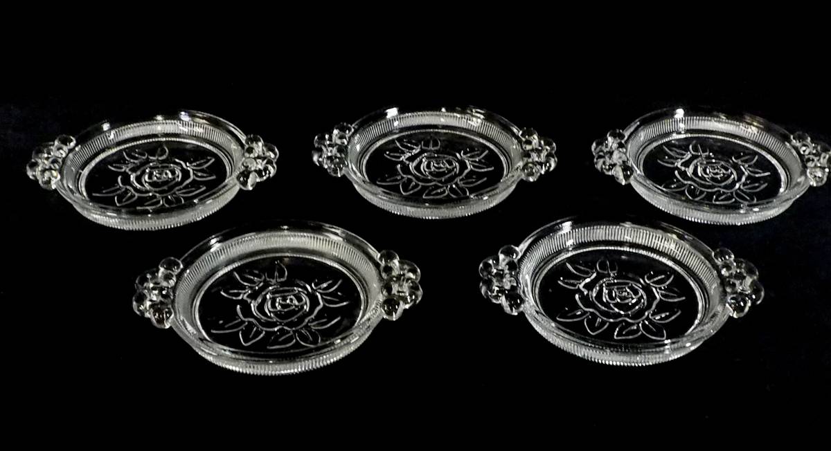 - 昭和ビンテージ TOYOガラス 薔薇の豆皿5枚セット プレスガラス ティーバッグトレイ 1970年代 直径9cm 高さ1.5cm YRT506