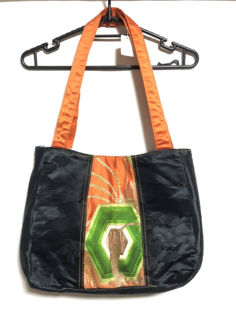 - *ハンドメイド* 着物 リメイク トートバッグ 黒×橙 正絹 幅34×縦27×マチ4.5cm ゆうメール発送 送料込み