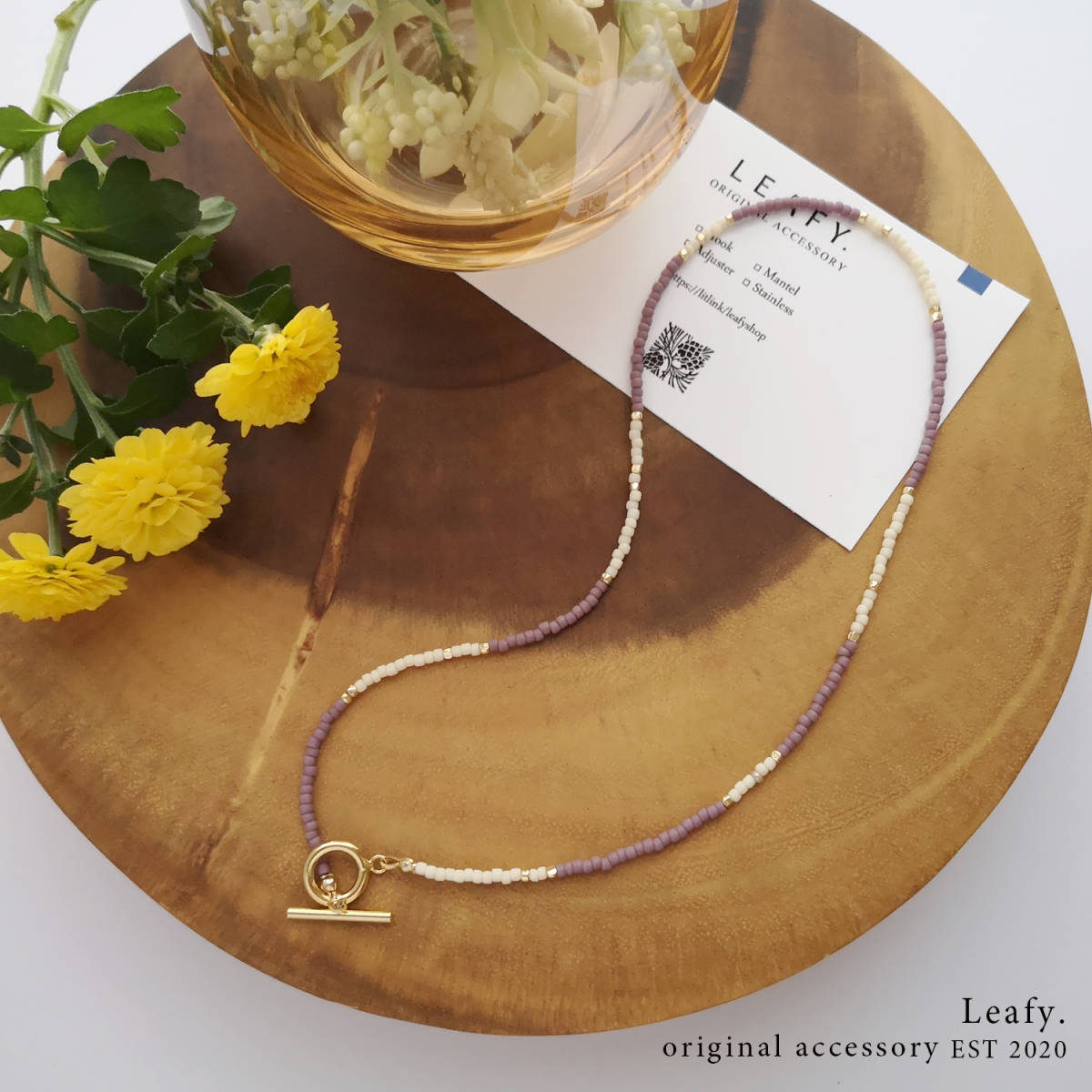- くすみパープルのショートビーズネックレス ビーズアクセサリー ゴールドミックス バイカラー マンテルネックレス