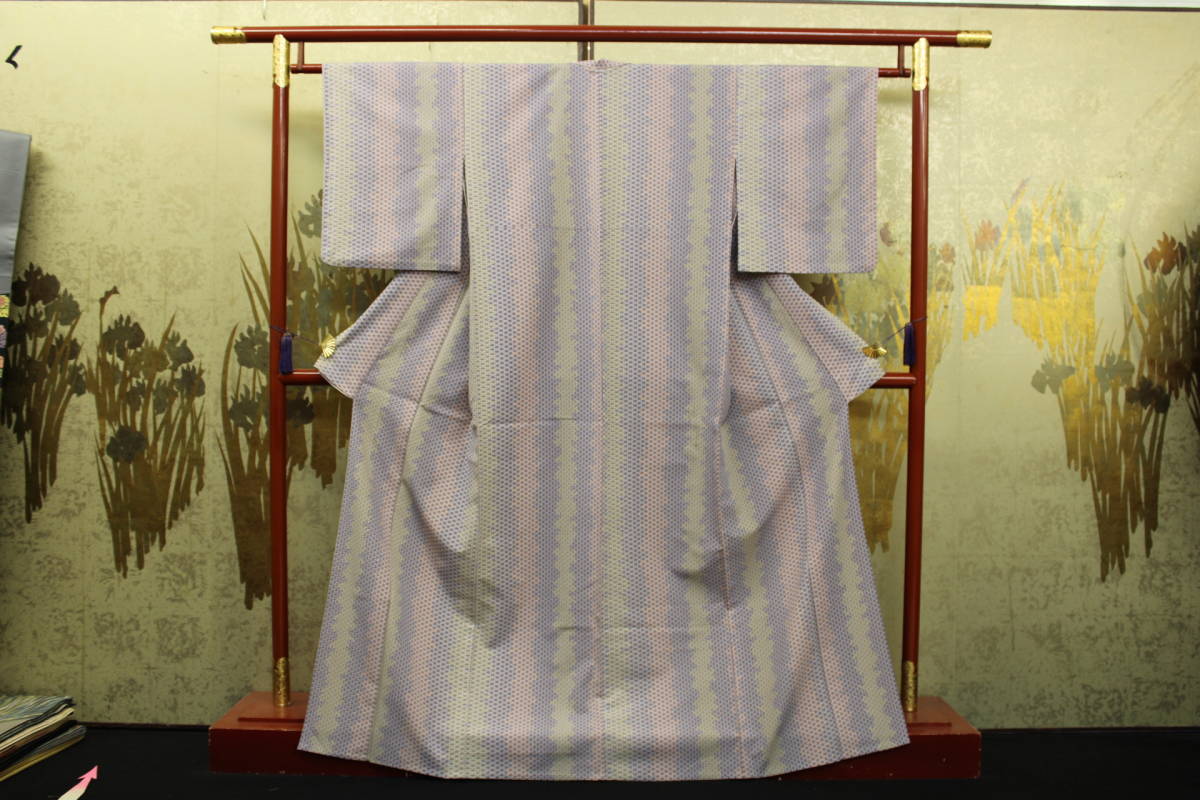 - きもの今昔5501 合繊のきもの 広衿単衣ミシン仕立て ポリエステル100% 虹色の麻の葉小紋柄 身丈164cm