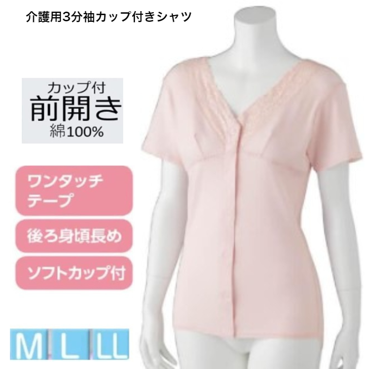 - 新品●送料無料 レディース 前開きワンタッチ マジックテープ 介護肌着 介護下着シャツ Lサイズ カップ付き 3分袖 半そで
