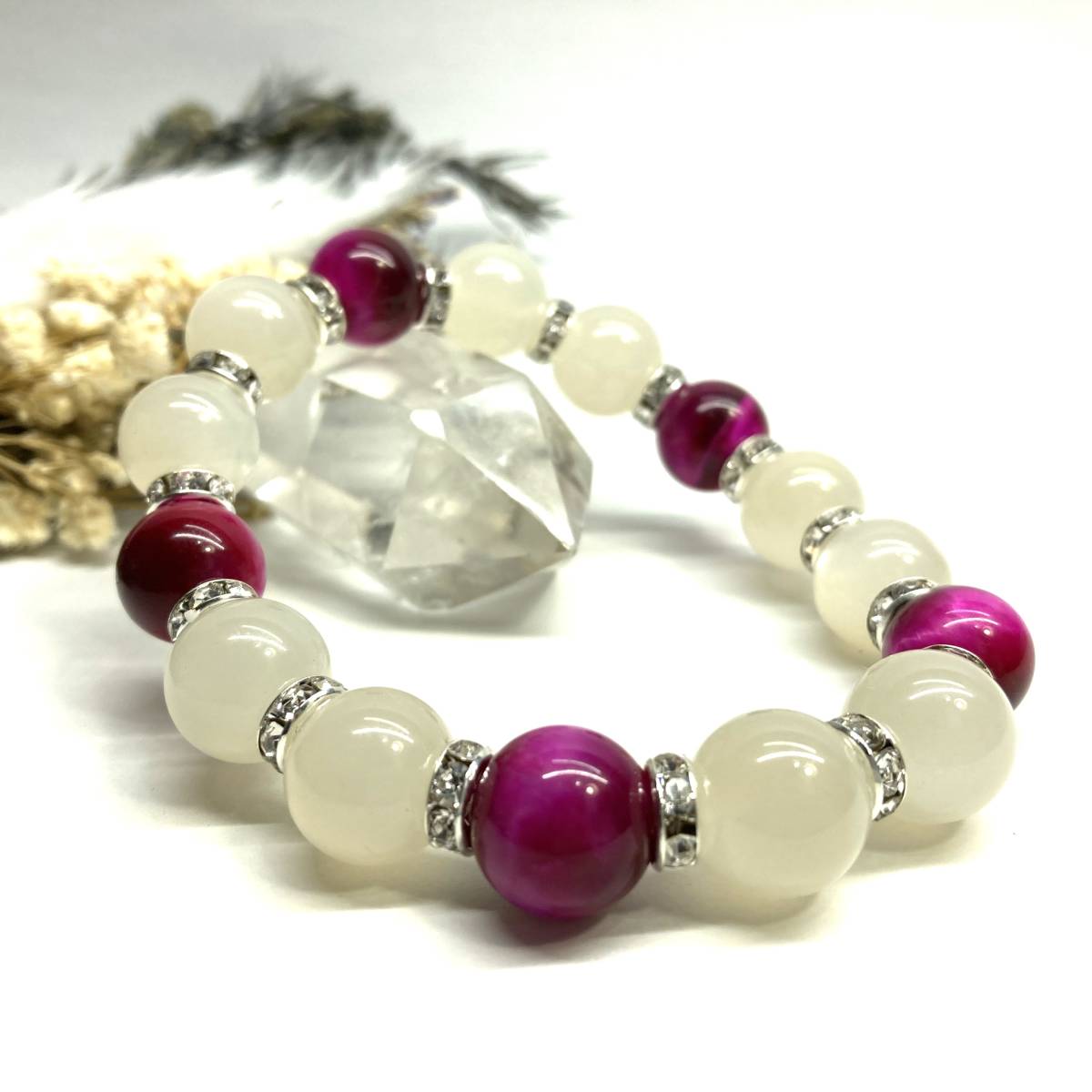 - ムーンストーン&ピンクタイガーアイ パワーストーン ブレスレット 天然石ブレス (シルバー) 12mm 幸運 開運 メンズ 男性