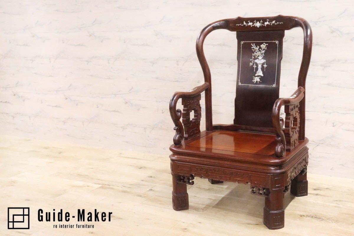 - GMGH205B○中国美術 アームチェア ラウンジチェア 椅子 唐木 天然木 花梨 螺鈿細工 彫刻 最高級