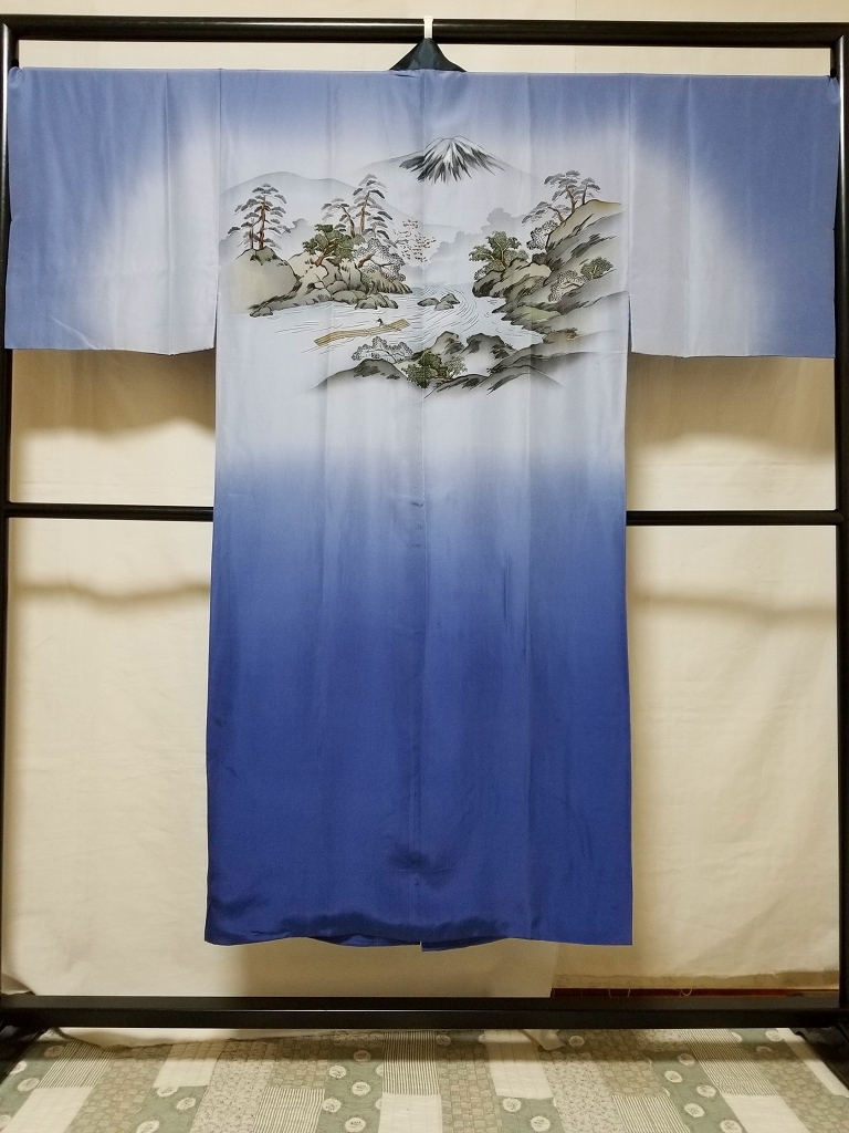 > 【桐徳】 紳士物*長襦袢☆送料無料☆未使用品*美品*仕付け糸付{正絹*袷.絵羽長襦袢}*丈143-裄70*薄群青色地*富士山と裾野風景*№6110