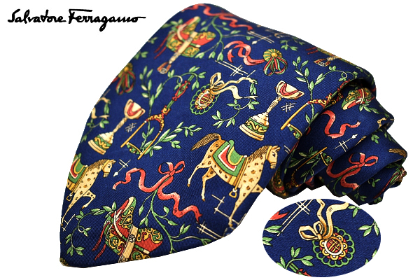 - N-2808★送料無料★超美品★Salvatore Ferragamo サルヴァトーレ フェラガモ★イタリア製 ブルー系 バロック ルネサンス 馬 シルクネクタイ