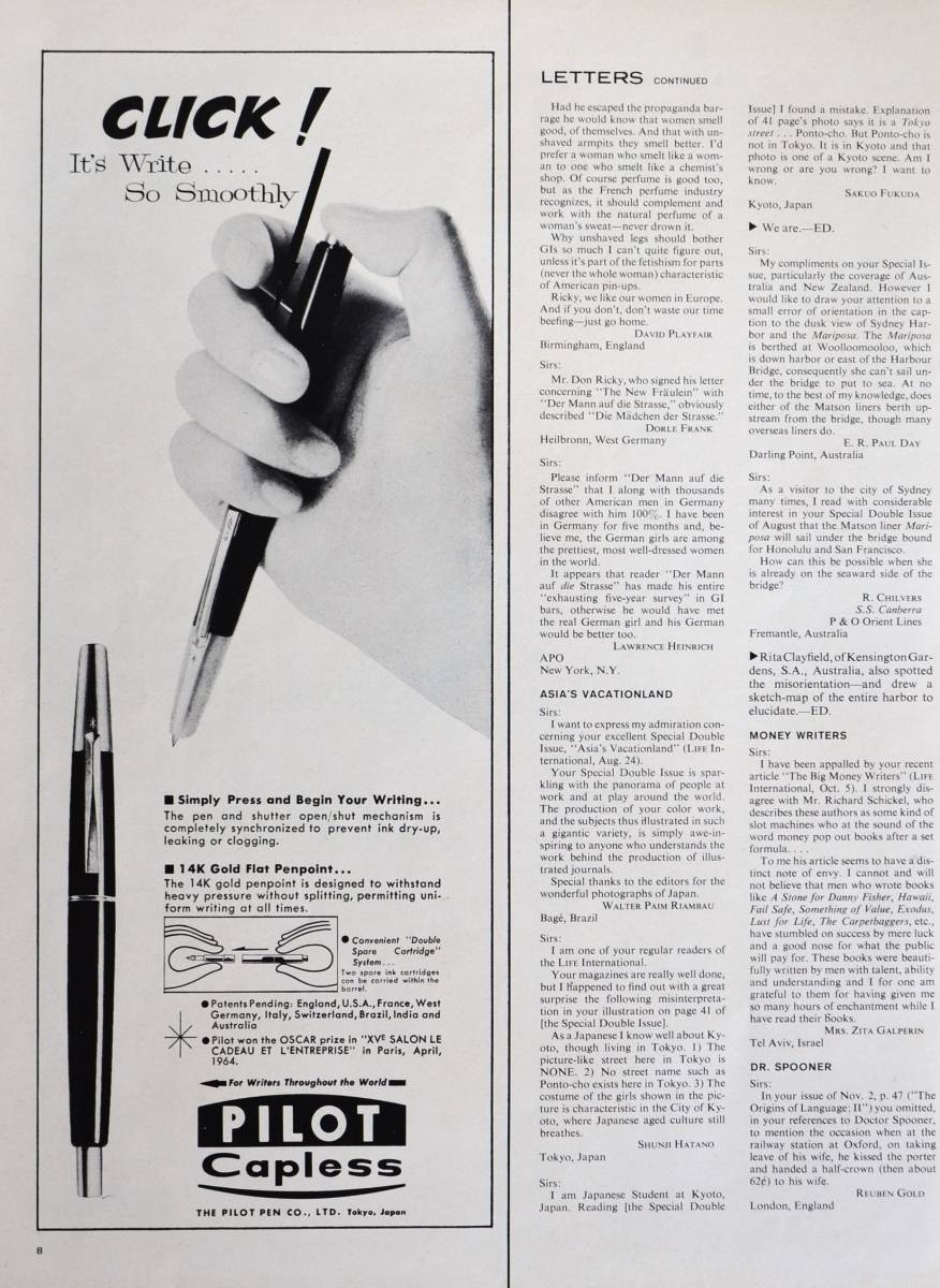 - 稀少・広告!1964年パイロット万年筆広告/Pilot Capless Fountain Pen/Push-button System/文房具/P