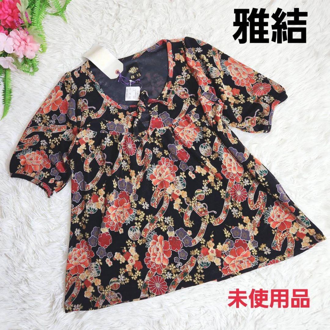- 雅結 ちりめん&和柄・Aライン・伸縮プルオーバー半袖トップス・総柄 表記サイズ1 S 未使用品 68031