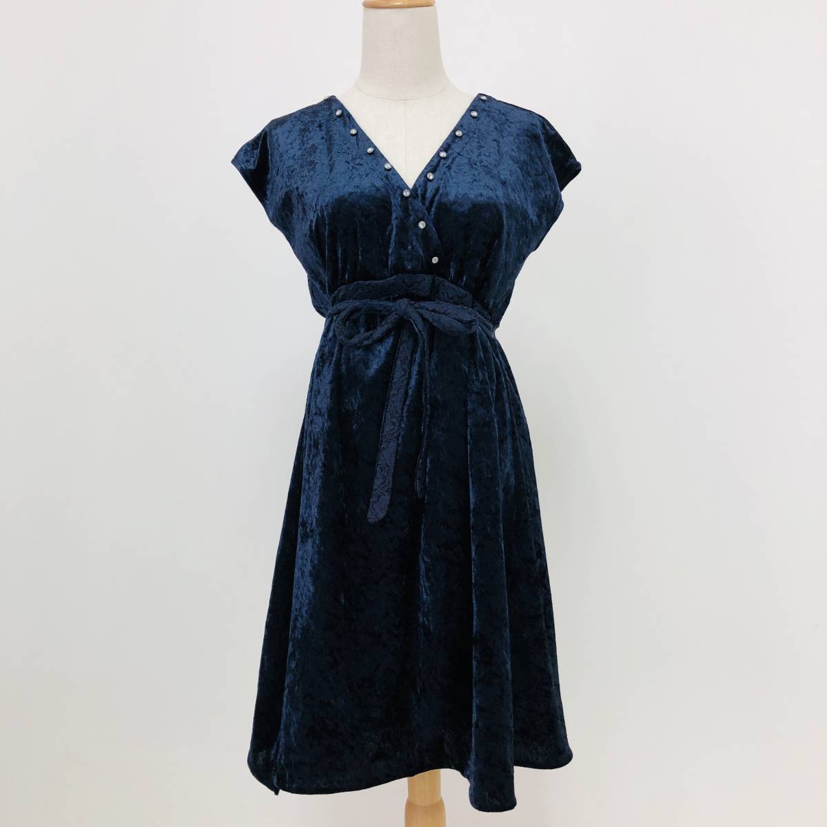 > k1501 美品 Q*TO*P キュートップ ワンピース ひざ丈 ベロア ビジュー ネイビー 光沢 高級感 ゴージャス 華やか エレガントガーリーチック