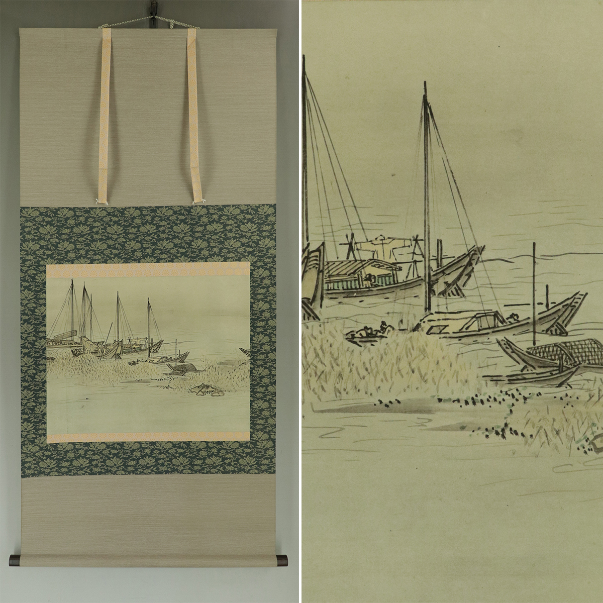 - 【巧芸】雪舟【四季山水 春景図】◆紙本◆共箱◆掛軸 u10135a