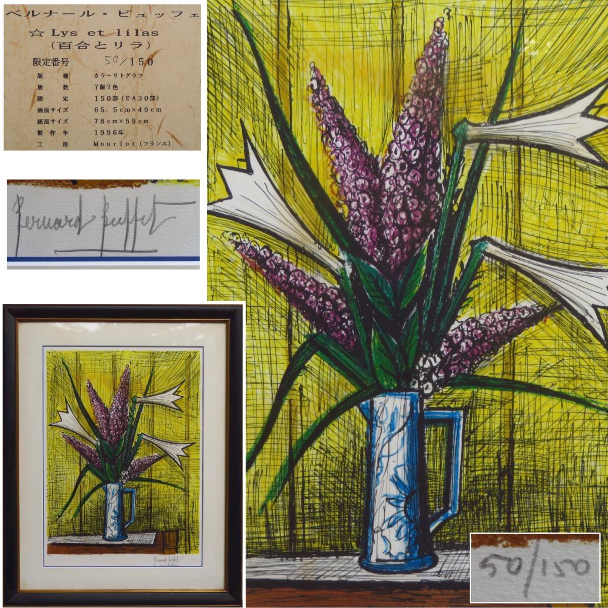 > 【SAKURAYA】真作保証 大型西洋アート作品【 百合とリラ /ベルナール・ビュッフェ】限定150部 リトグラフ 絵画 美術 額装 作家 96.2×76.6