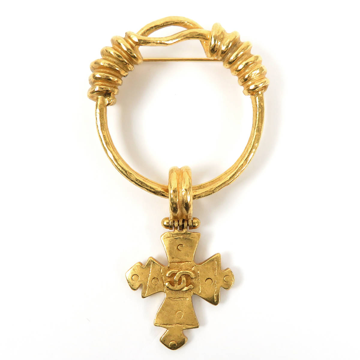 - 極美品 ヴィンテージ CHANEL シャネル 94P サークル クロス ココマーク ブローチ ゴールドカラー スイング ドロップ レディース