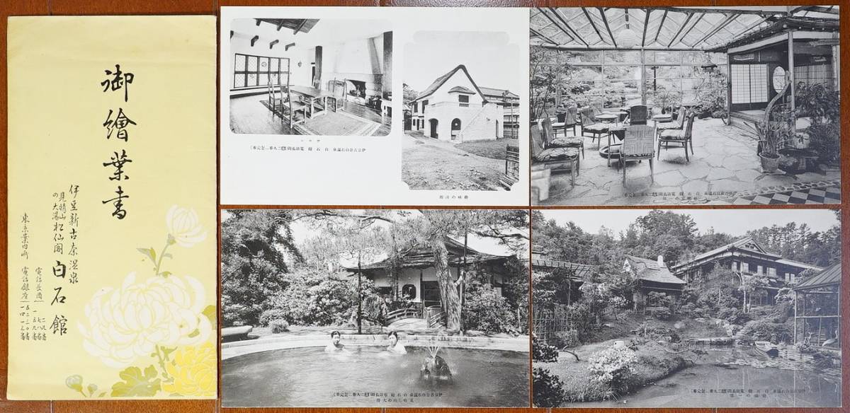 - 伊豆新古奈温泉 白石館 絵葉書4枚 紙ケース付き 検:見晴山の大湯 娯楽室 庭園 サロン 洋館 静岡観光 伊豆長岡温泉 三養荘 野天風呂