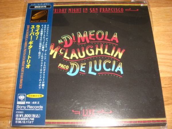 アルディメオラ、パコデルシア、ジョンマクラフリンのスーパーギタートリオの説明不要のギターバトルライブをマスターサウンド紙ジャケで復刻したものです。なんと言ってもアルディメオラとパコデルシアの「地中海の舞踏~広い河」の凄まじいギターデュオが最高です