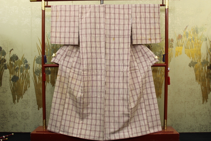 > きもの今昔6167 紬のきもの 広衿袷仕立てきもの 正絹薄色地紫3本縞格子 薄い汚れ有り 身丈156CM