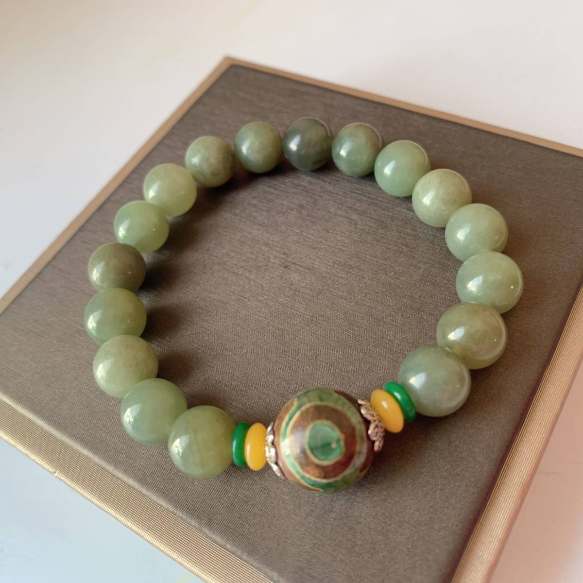 > ◇和田玉+瑪瑙(三目天珠)◇ブレスレット◇パワーストーン◇天然石◇巾着袋付き◇プレゼントにも026B120810