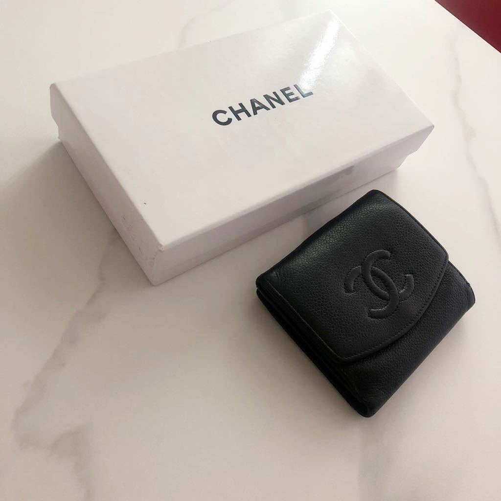 > ◆◆◆CHANEL シャネル キャビアスキン Wホック 黒 ブラック 折り畳み財布 フランス製