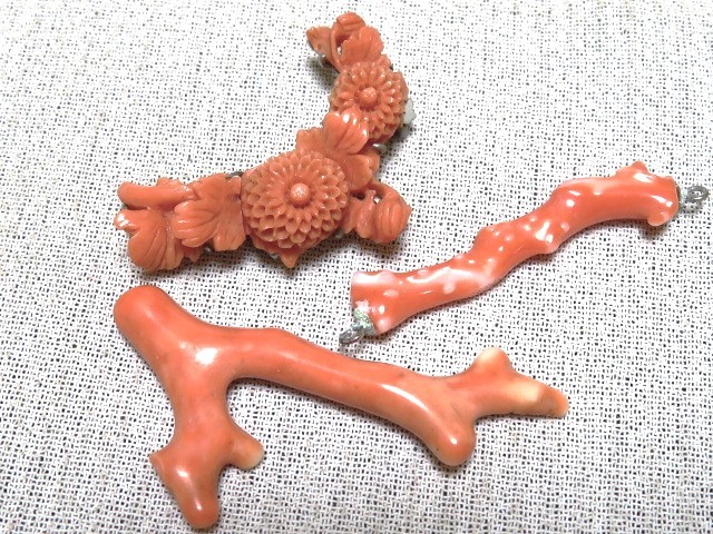 - 珊瑚細工まとめて3点 菊花 彫刻細工 枝サンゴ アクセサリー アンティーク