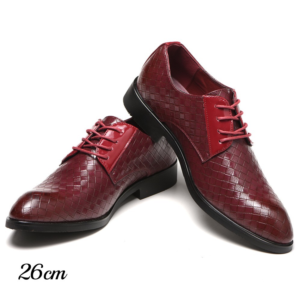 - ☆ビジネスシューズ メンズ シューズ 紐靴 PU革靴 ロングノーズ 編み柄 紳士靴 オシャレ レースアップ ワイン 26cm